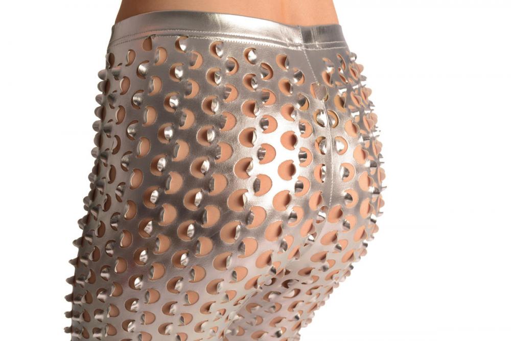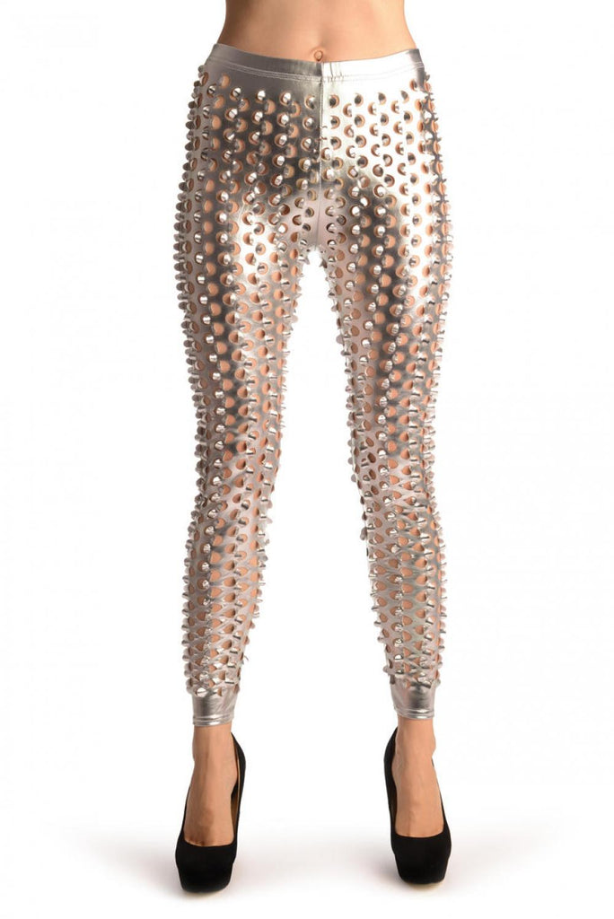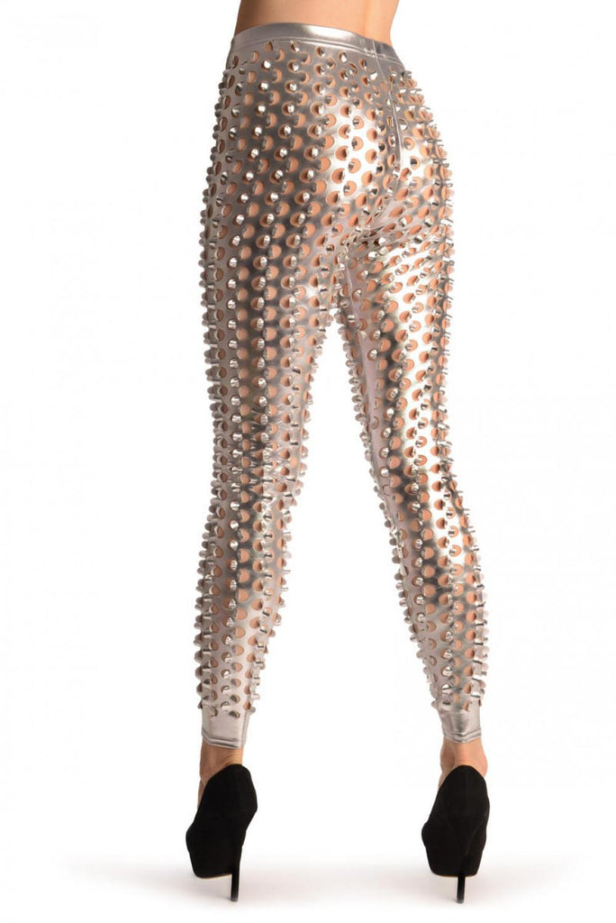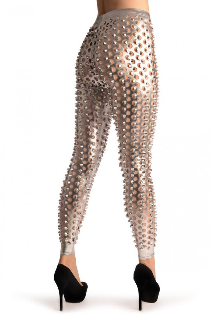 Silver 3D Cut Through Faux Leather Spikes - Leggings