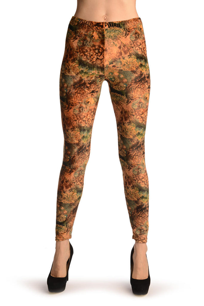 Beige Orange & Brown With Reindeers Aztec Jacquard Knit Print - Leggings