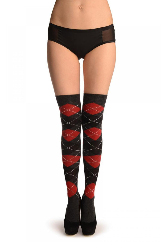 Red, Grey & Black Argyle - Over The Knee Socks