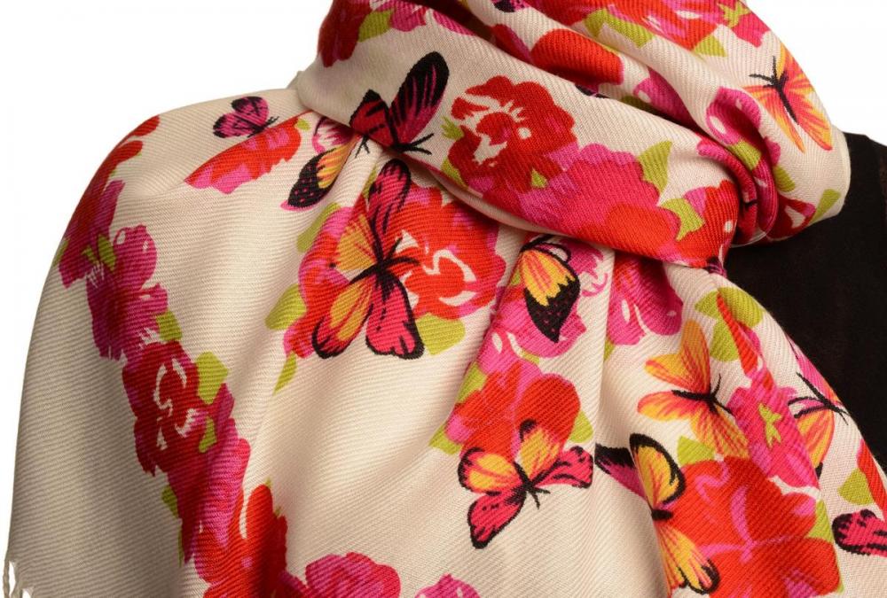 Red Butterflies & Flowers On White Pashmina Feel With Tassels