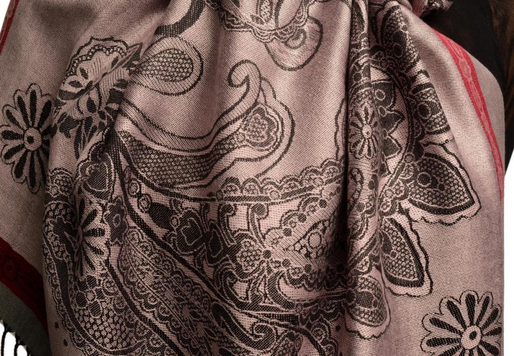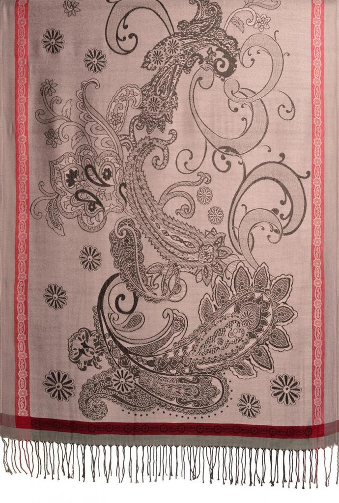 Red Frame & Paisleys On Amaranth Pink Pashmina Feel With Tassels - Scarf