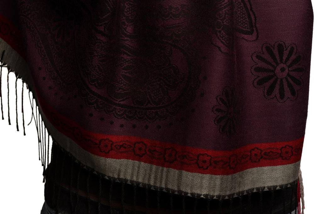 Red Frame & Paisleys On Dark Purple Pashmina Feel With Tassels - Scarf