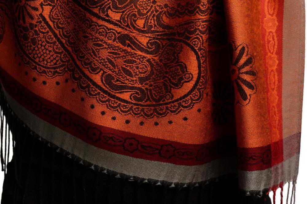 Red Frame & Paisleys On Orange Pashmina Feel With Tassels