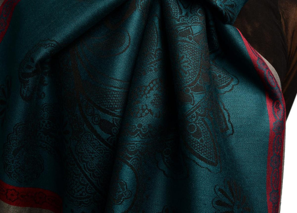 Red Frame & Paisleys On Prussian Blue Pashmina Feel With Tassels