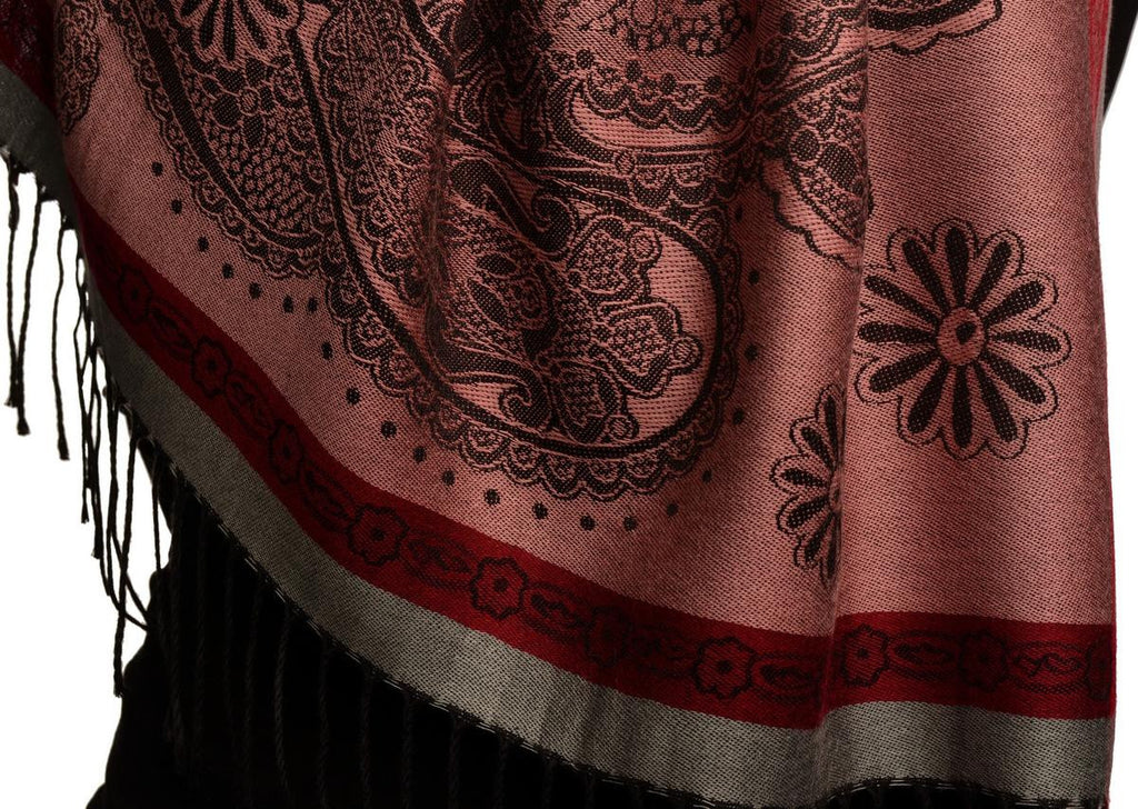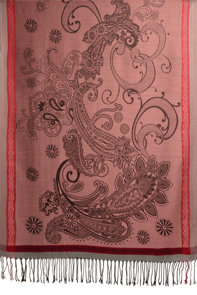 Red Frame & Paisleys On Puce Pink Pashmina Feel With Tassels