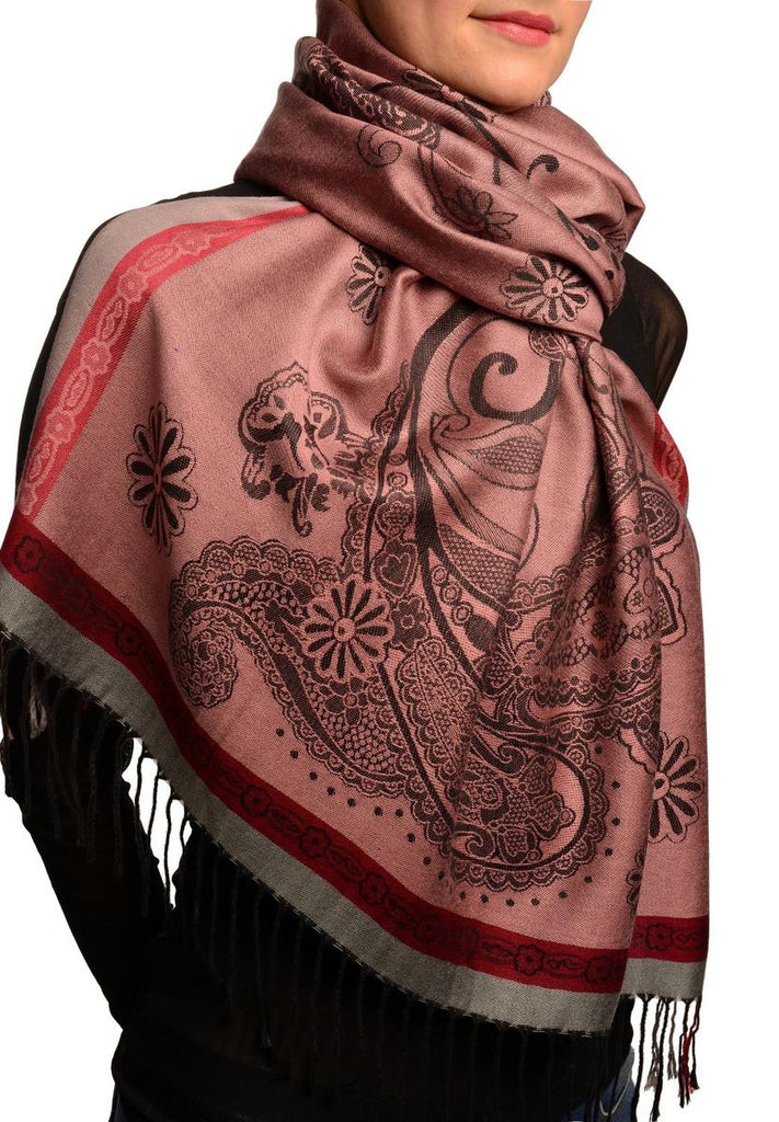 Red Frame & Paisleys On Puce Pink Pashmina Feel With Tassels - Scarf