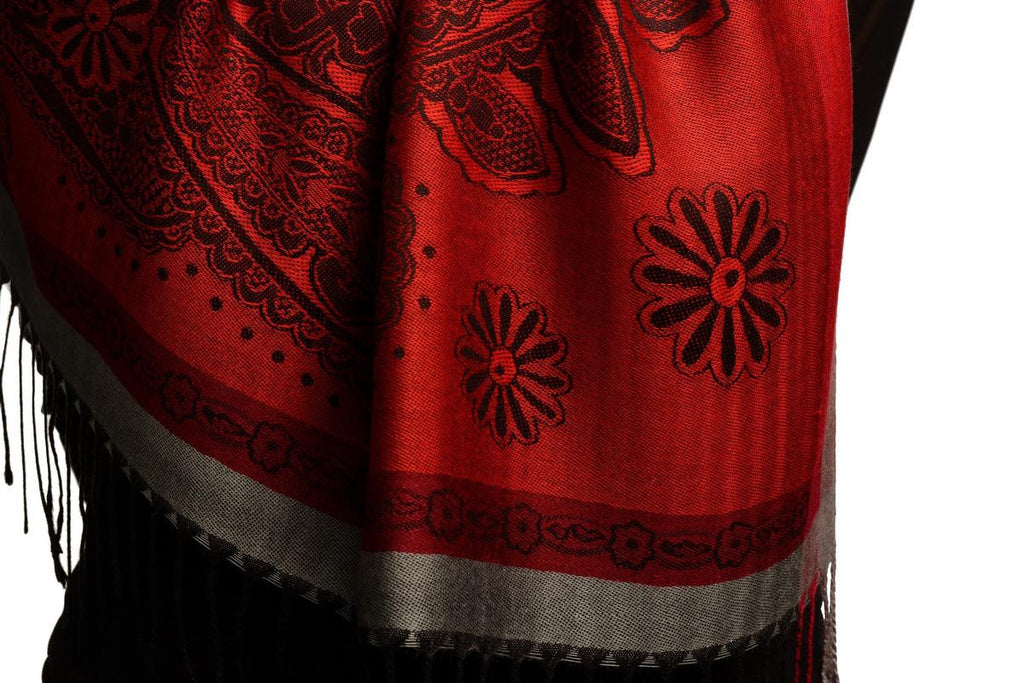 Red Frame & Paisleys On Red Pashmina Feel With Tassels - Scarf