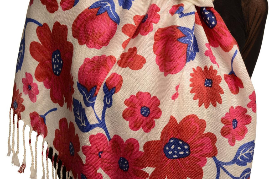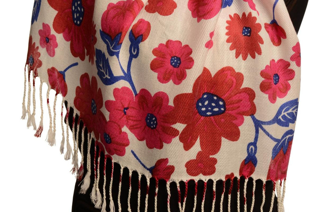 Red Large Flowers On White Pashmina Feel With Tassels - Scarf
