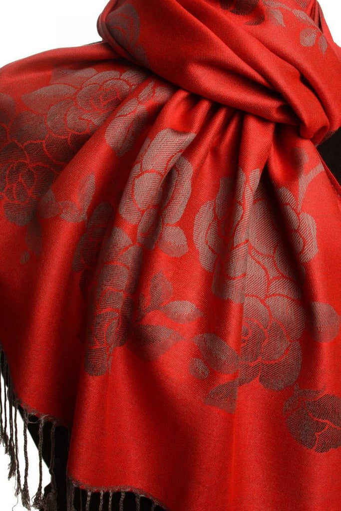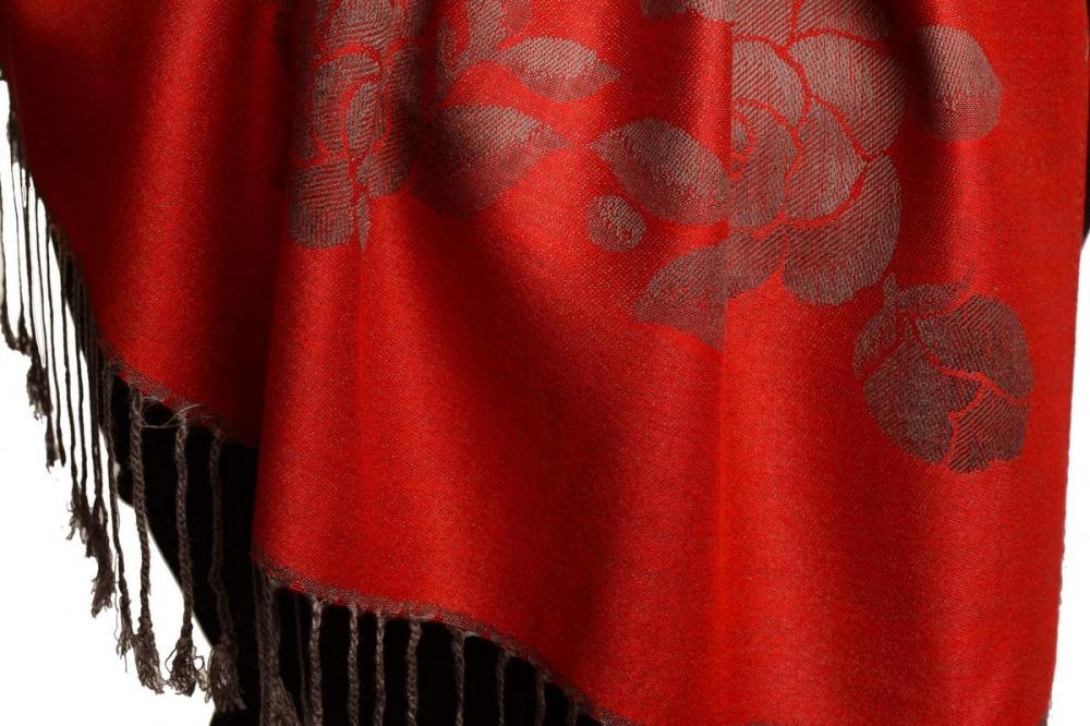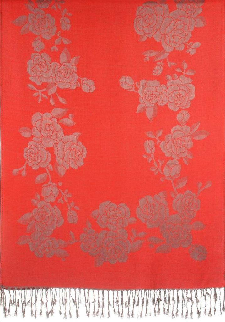 Roses On Red Pashmina With Tassels - Scarf
