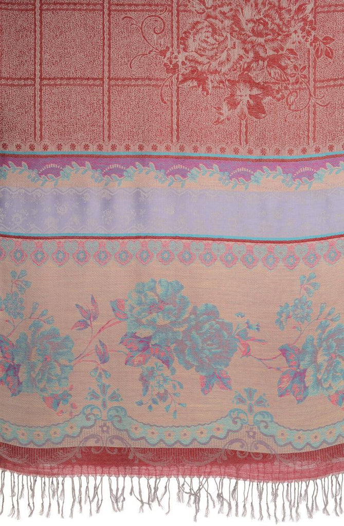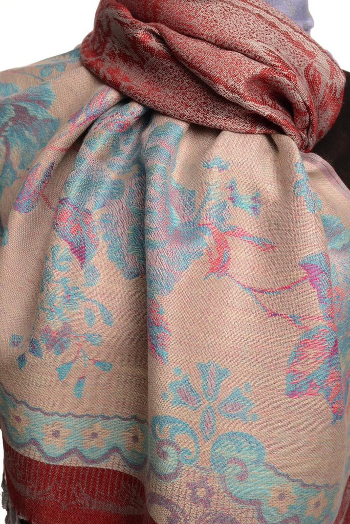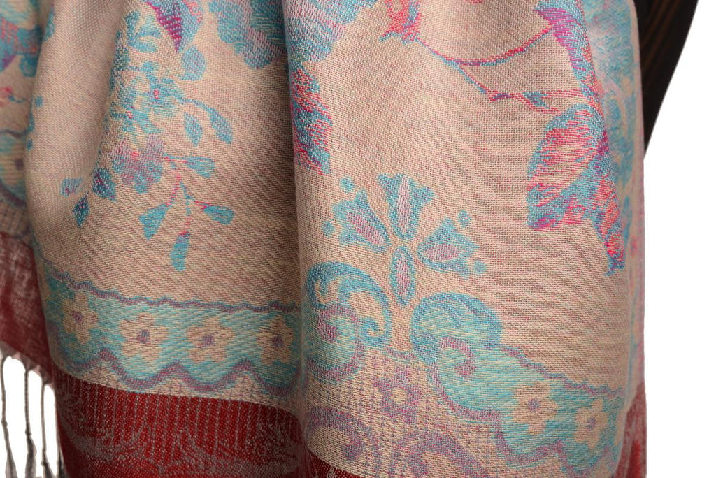 Vintage Roses On Burgundy Red Pashmina With Tassels - Scarf