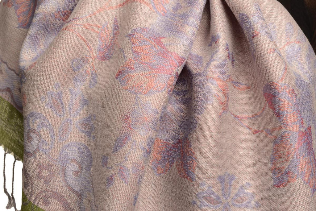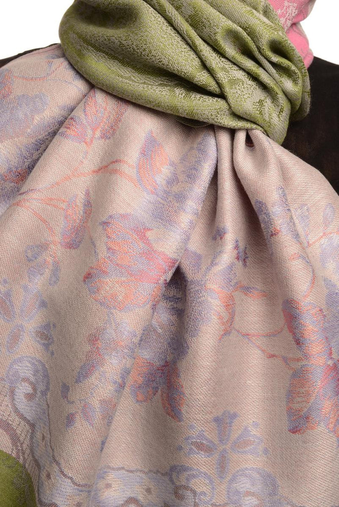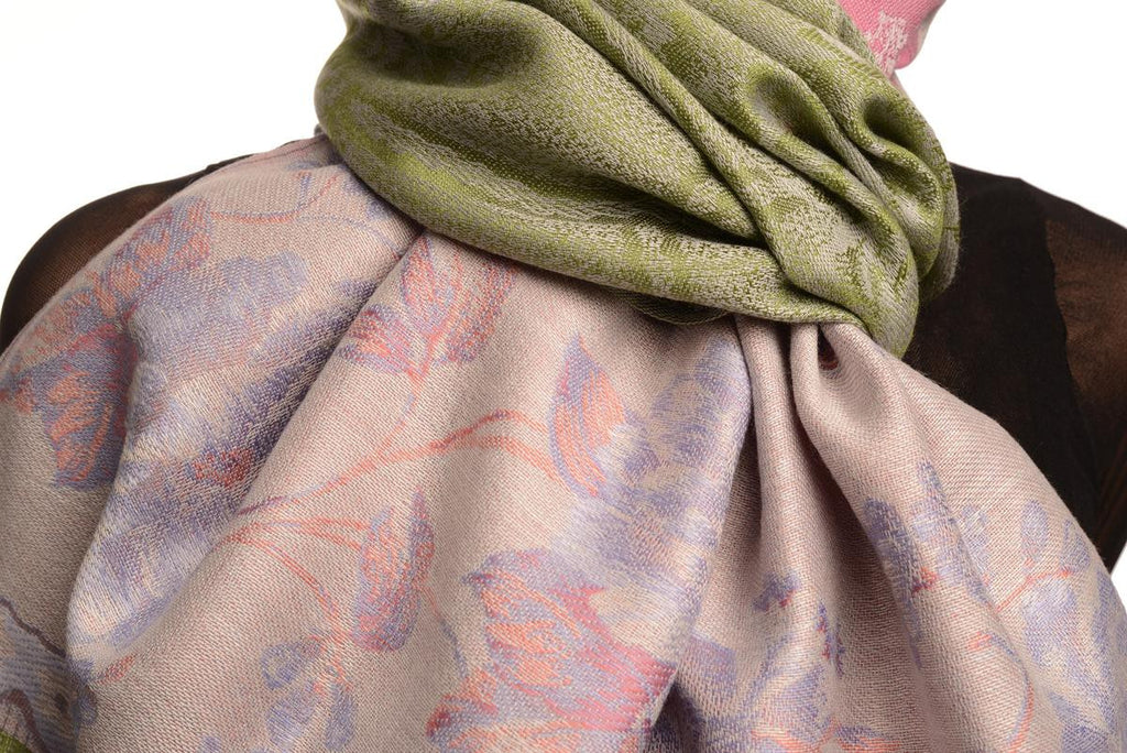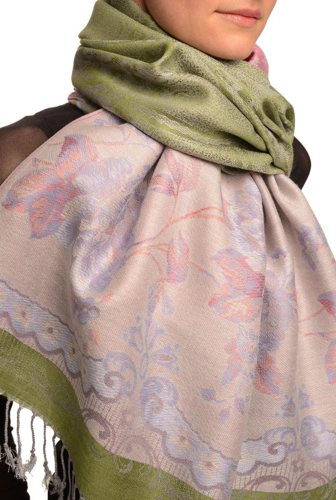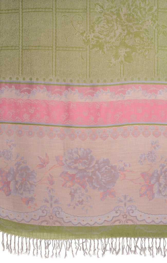 Vintage Roses On Olive Green Pashmina With Tassels - Scarf