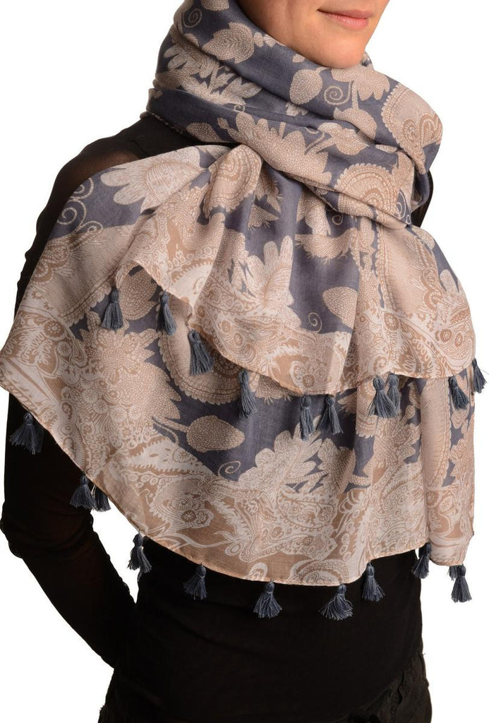 White & Brown Paisley On Blue Scarf With Tassels - Scarf