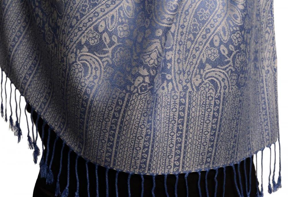 Assimetrical Ornaments On Blue Pashmina With Tassels - Scarf
