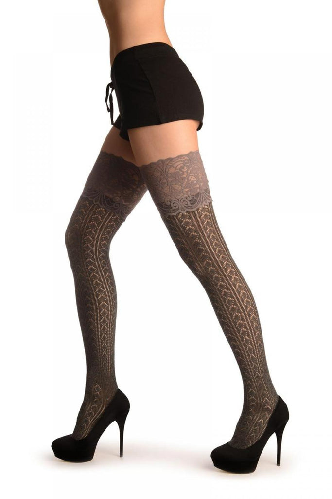 Grey Diamond Crochet Knit With Wide Lace Trim - Over The Knee Socks